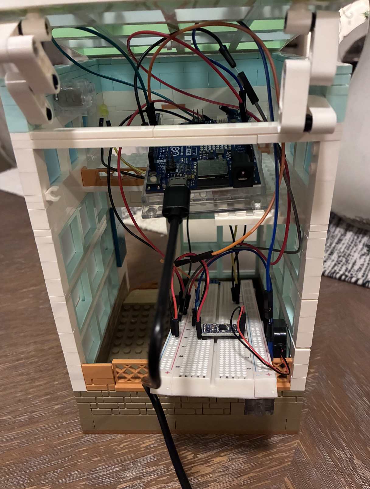 Through iterative exploration—moving from woodcut forms, to repurposed boxes, and ultimately to a LEGO house—I selected a structure that offered both visual impact and the spatial flexibility needed to house the Arduino, PIR sensor, light, and sound components. By intentionally constructing only the exterior base, I preserved structural integrity and visual clarity while saving time.